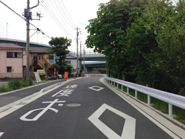 ⑤川沿いの道を直進すると、左手に青い看板が見えます。